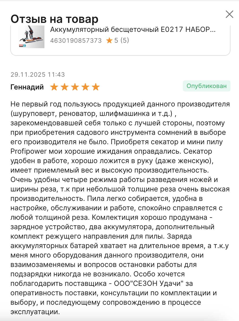 "Не первый год пользуюсь продукцией данного производителя (шуруповерт, реноватор, шлифмашинка и т.д.) , зарекомендовавшей себя только с лучшей стороны, поэтому при приобретения садового инструмента сомнений в выборе его производителя не было. Приобретя секатор и мини пилу Profipower мои хорошие ожидания оправдались.