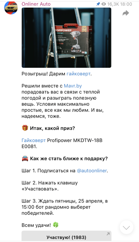 Onliner.by проводит розыгрыш нашего гайковерта на 330Нм в своем телеграмм канале, нужно всего-то нажать кнопку "Учавствовать". Не упусти возможность побороться за приз!!!
