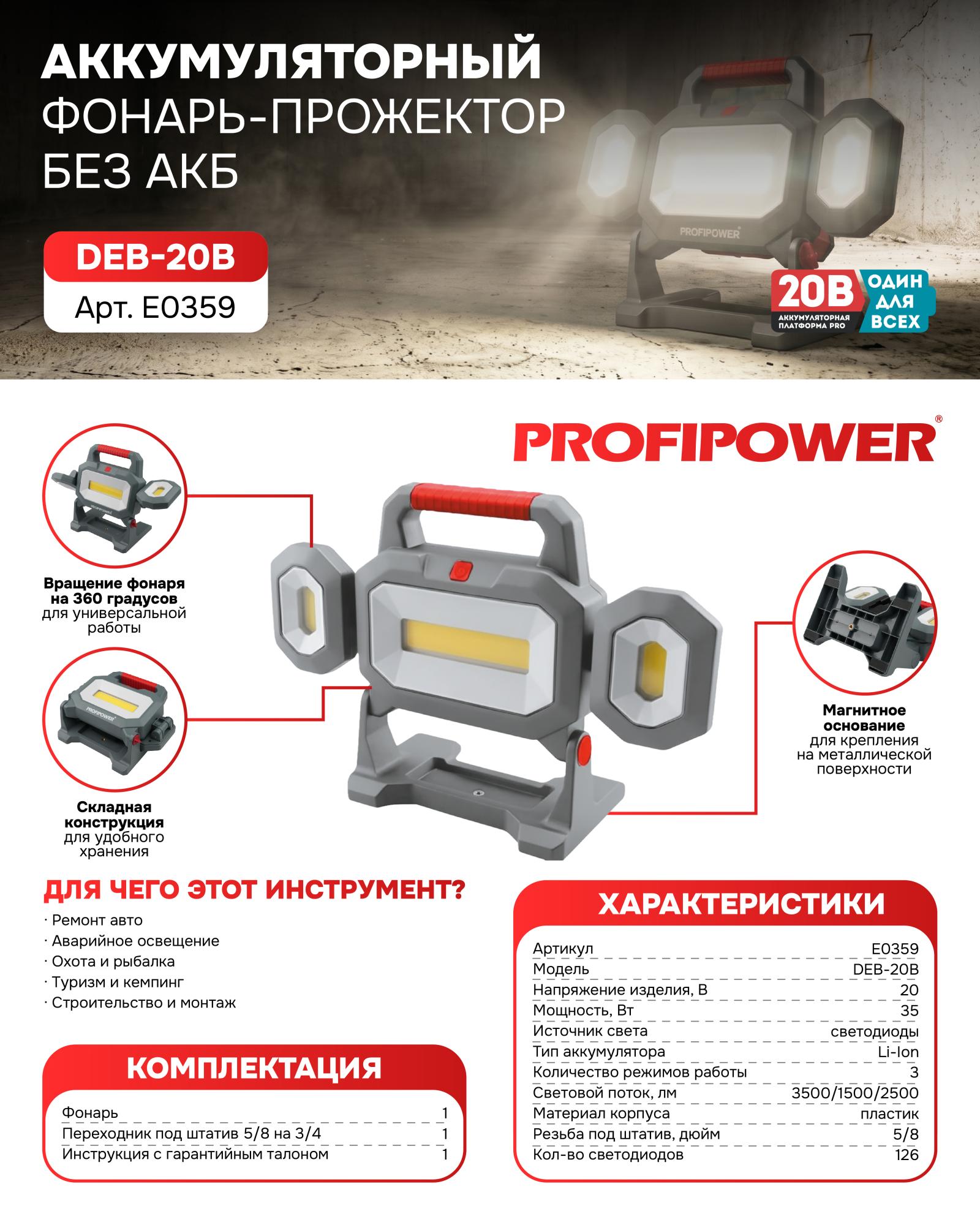 Аккумуляторный фонарь-прожектор PROFIPOWER DEB-20B — это мощное решение на базе современной платформы 20В. Благодаря яркому световому потоку до 3500 Лм и 126 светодиодам, этот прожектор обеспечит идеальную видимость даже на крупных объектах.