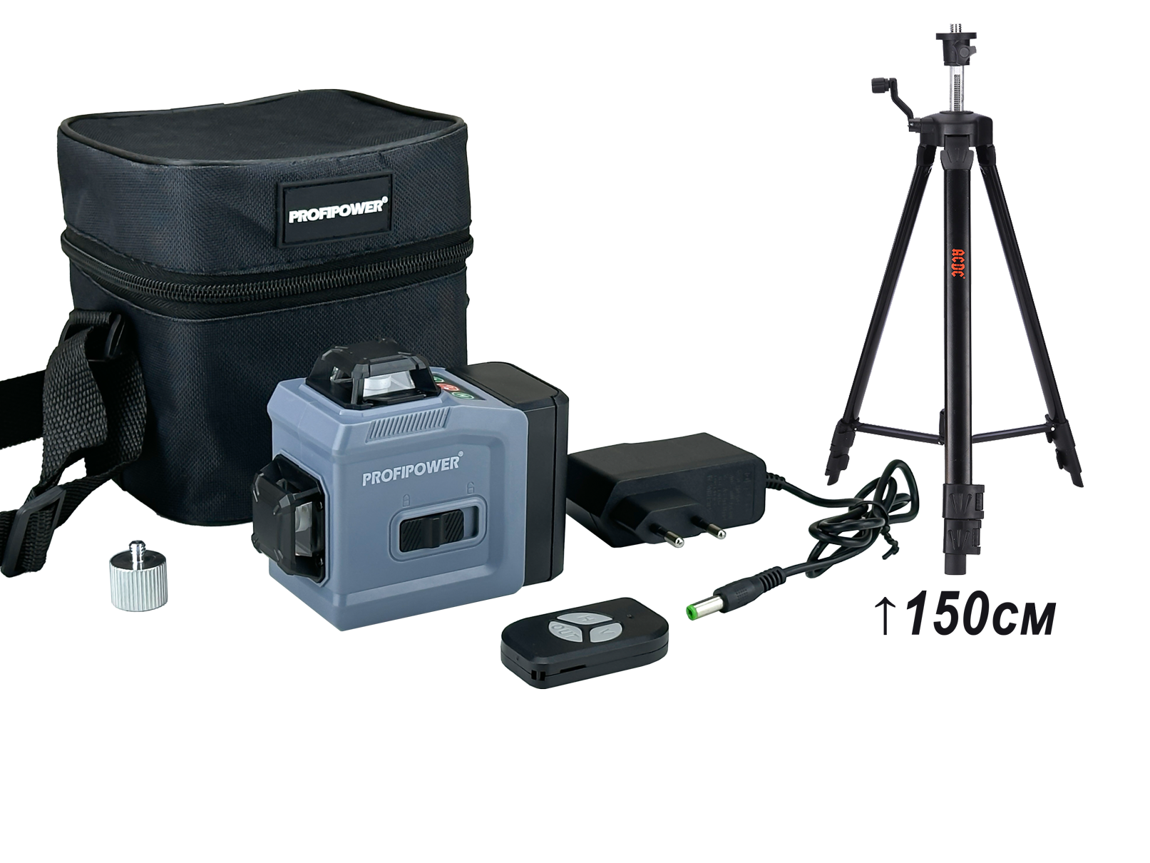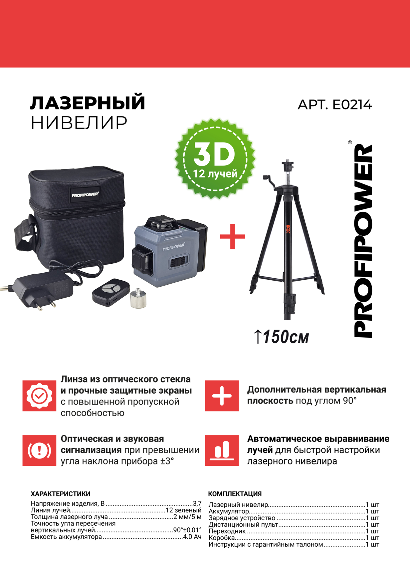 Лазерный уровень проецирует 2 горизонтальные и 2 взаимно перпендикулярные вертикальные круговые (360°) линии с пересечениями на 4-х стенах, на полу и на потолке.
