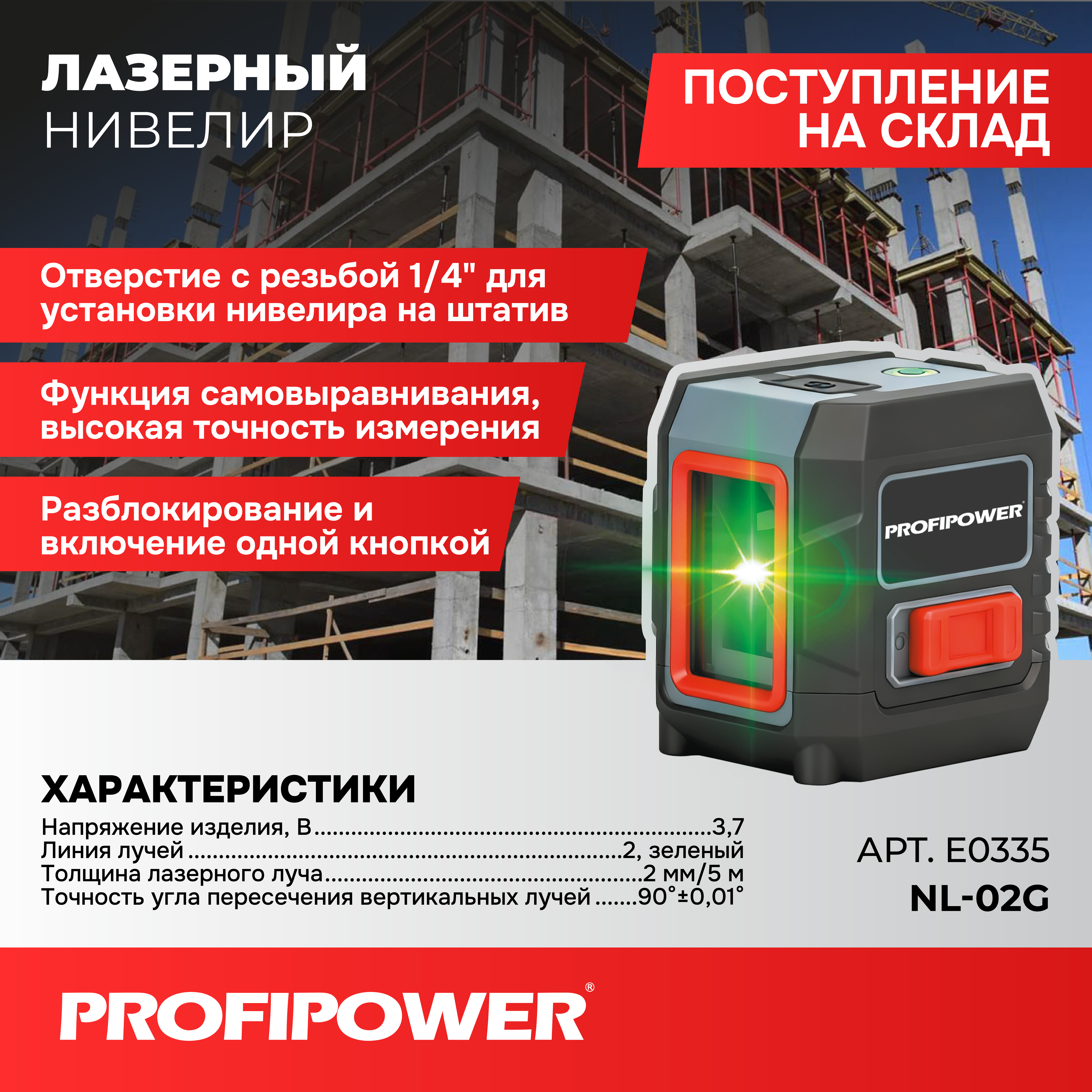 —Лазерный нивелир E0335-2 PROFIPOWER NL-02G + Штатив E0051, Высота 1,5м