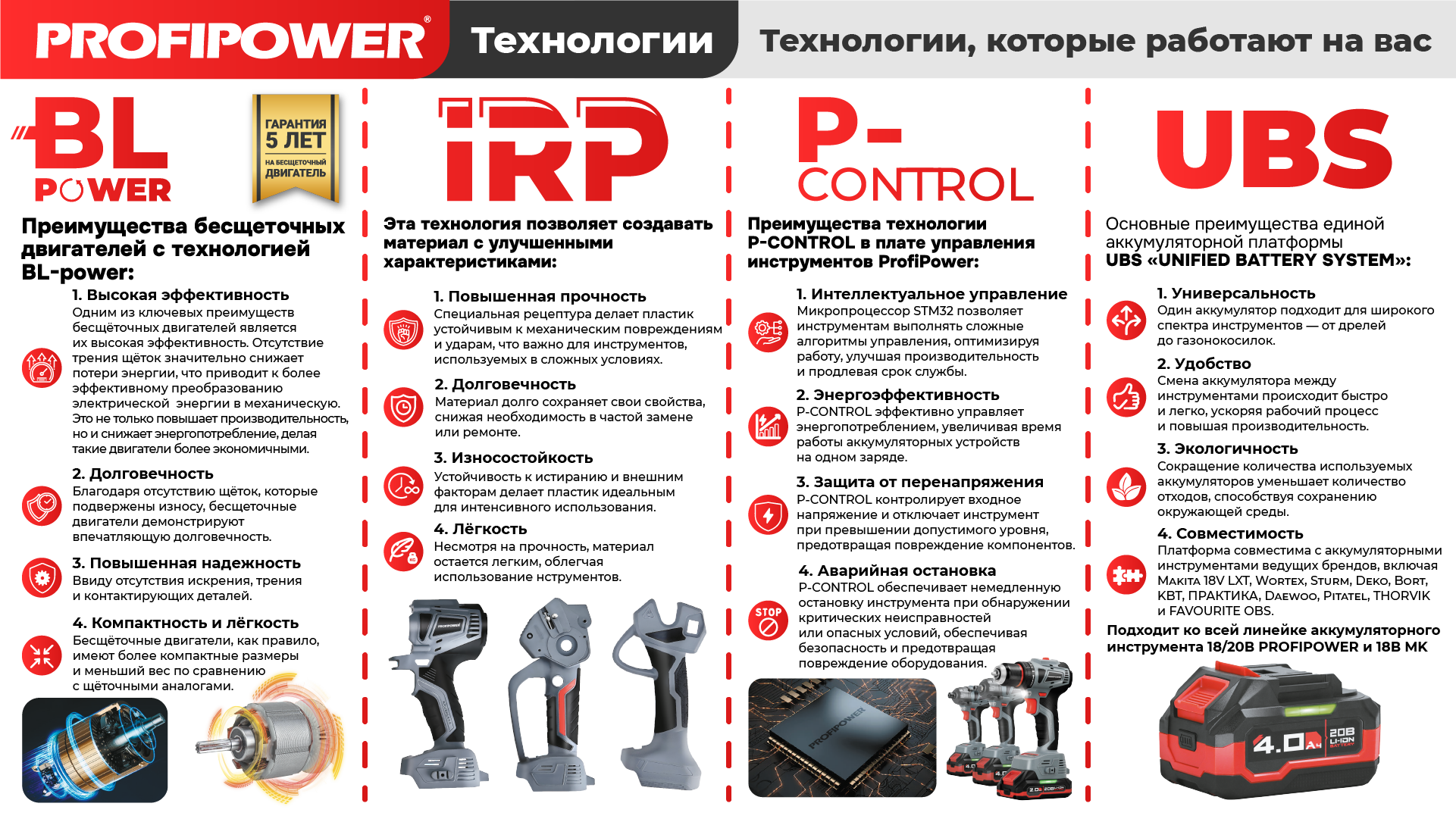 - Универсальная аккумуляторная система (UBS): Совместимость с аккумуляторами других ведущих брендов (Makita, Wortex и др.) позволяет экономить и использовать один АКБ для множества инструментов.