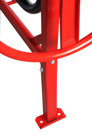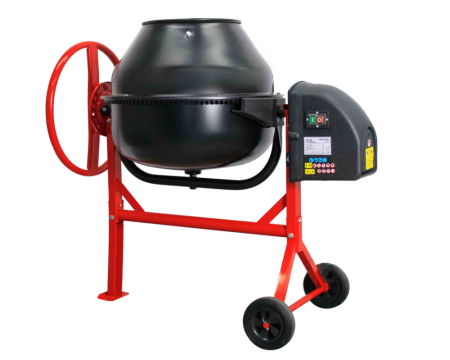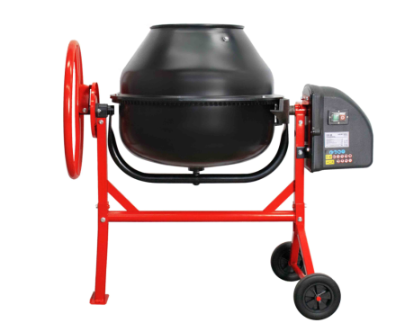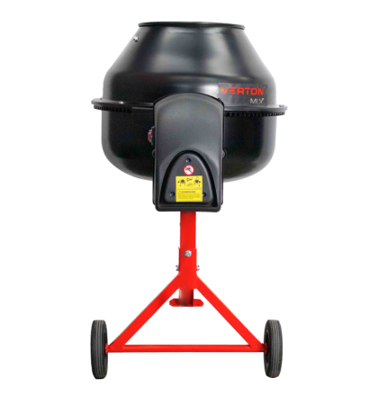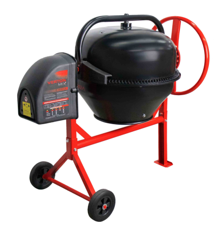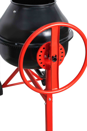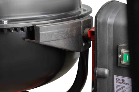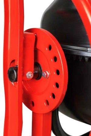 Траверса с закрепленным на ней барабаном фиксируется к опорной раме (через втулки и опорные подшипники. С одной стороны рамы расположен механизм опрокидывания емкости с фиксатором для создания необходимого рабочего угла и возможности выгрузки готового раствора. С другой стороны, прикреплен блок электродвигателя и рабочая шестерня.