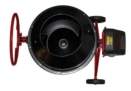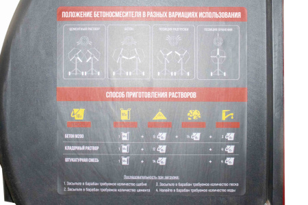 Траверса с закрепленным на ней барабаном фиксируется к опорной раме (через втулки и опорные подшипники. С одной стороны рамы расположен механизм опрокидывания емкости с фиксатором для создания необходимого рабочего угла и возможности выгрузки готового раствора. С другой стороны, прикреплен блок электродвигателя и рабочая шестерня.